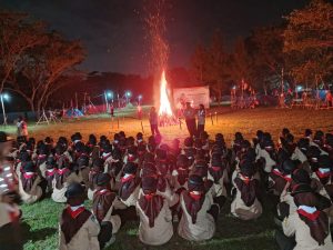 Prosesi penyalaan api unggun menjadi momen puncak yang paling dinantikan. Kegelapan dan dinginnya malam seketika pecah oleh langkah tegap Pasukan Inti pembawa obor. Dengan lantang, sepuluh nilai luhur Dasa Darma Pramuka diucapkan secara bergantian, diiringi penyalaan obor yang kemudian disulutkan ke tumpukan kayu utama. Api pun berkobar memancarkan cahaya keemasan, menghangatkan suasana sekaligus membakar semangat persaudaraan seluruh peserta yang hadir.